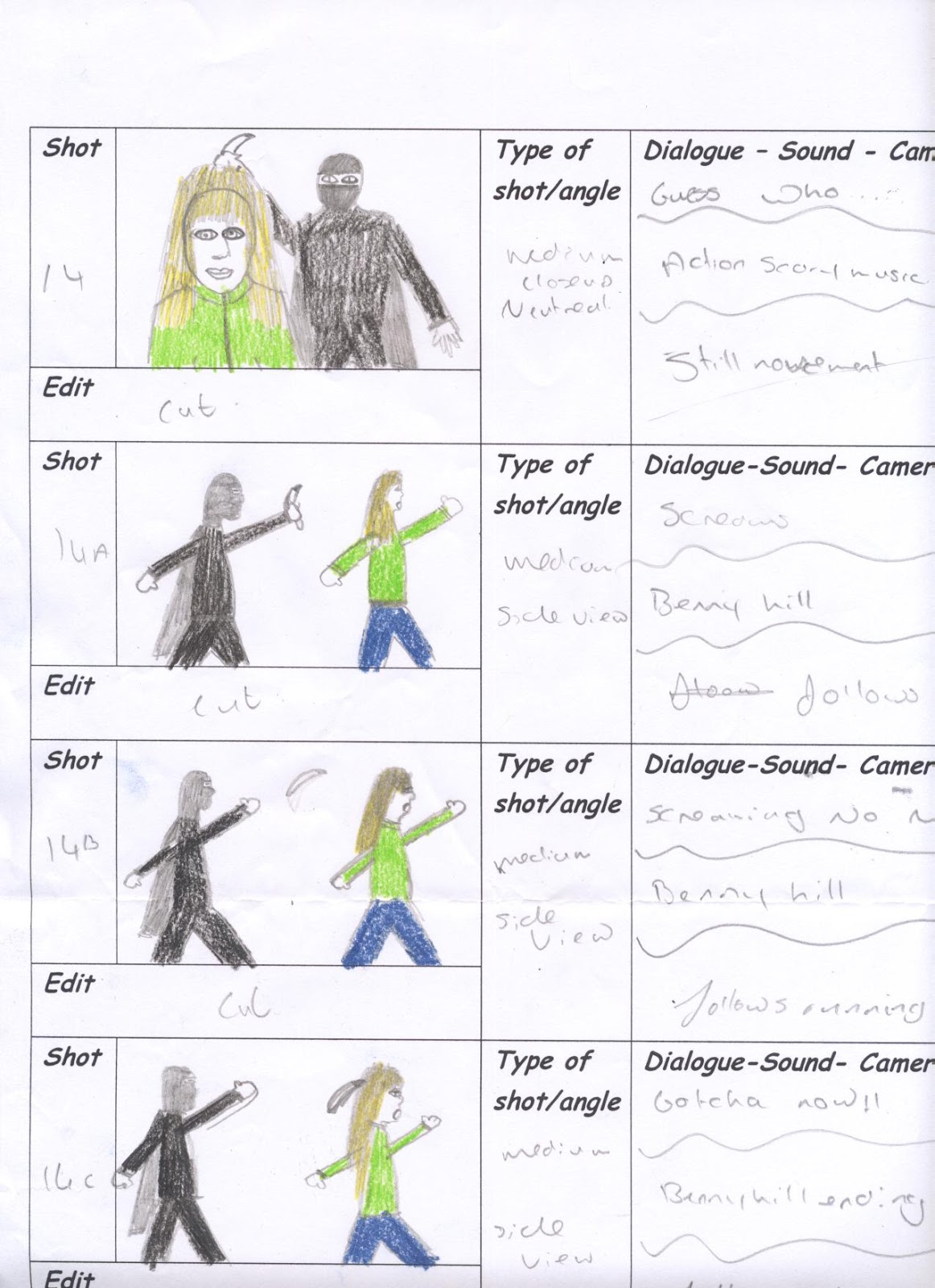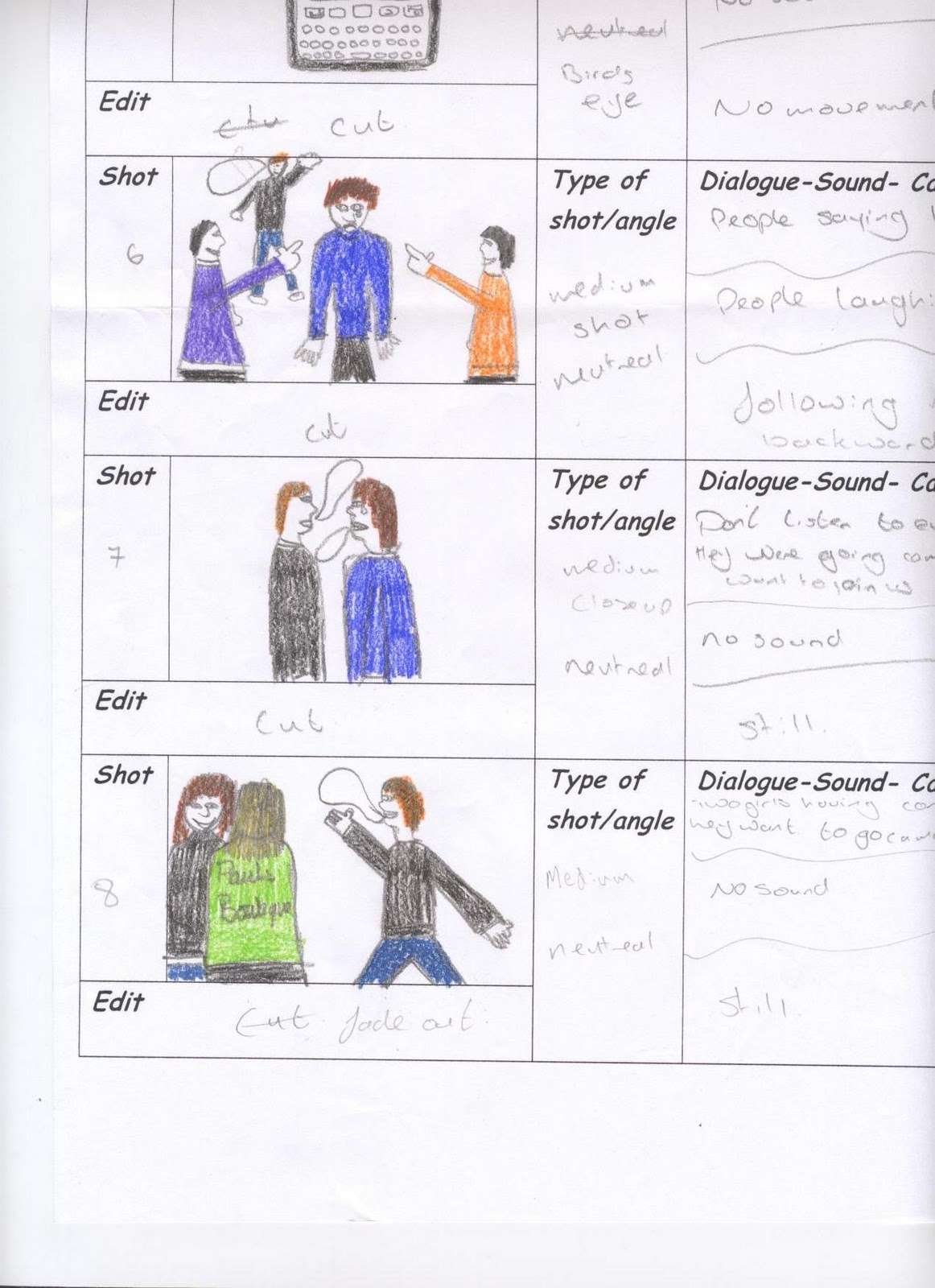 This is the story board which is used to show the audience every step of whats happening in our groups film opening. It is important for our group to have planned out a story board because without it we would not know ourselves what is going to happen in each scene.